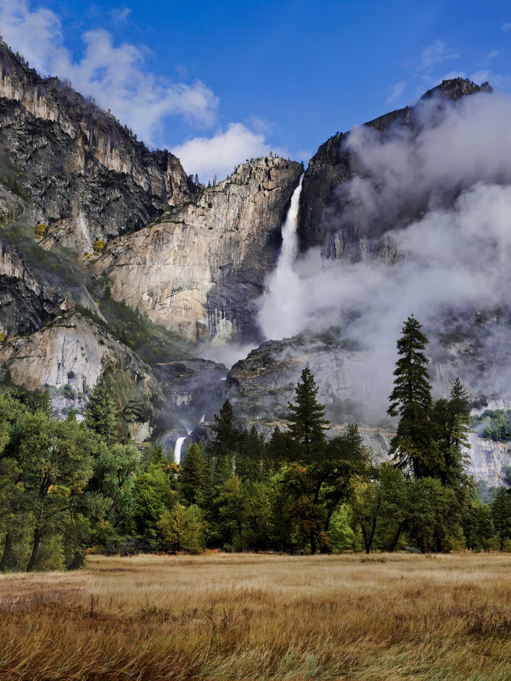 Yosemite Falls — one of the most iconic natural wonders in Yosemite National Park, cascades powerfully down the granite cliffs, filling the valley with its thunderous roar and misty beauty.